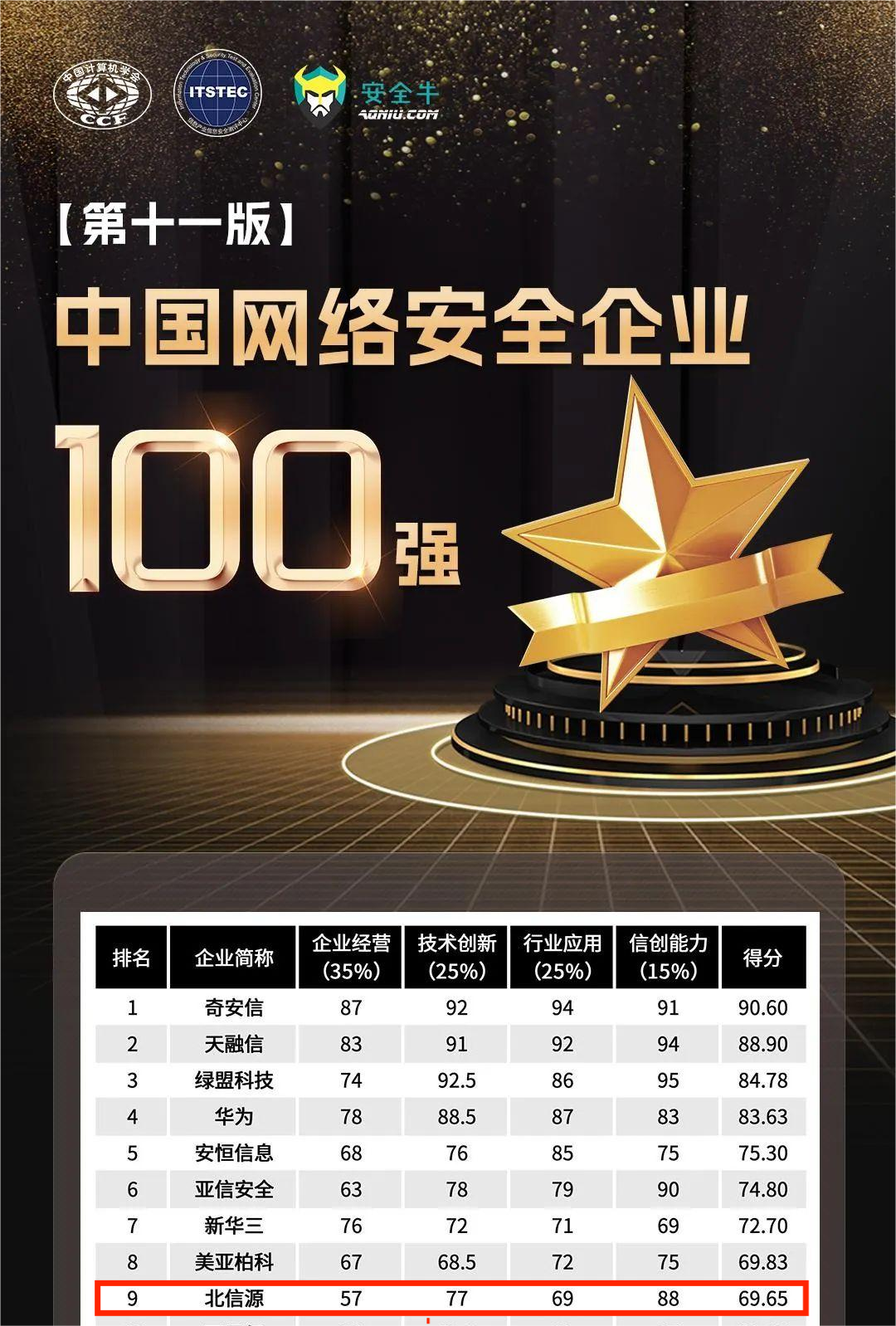 12月1日,中国计算机学会抗恶劣环境计算机专业委员会、信息产业信息安全测评中心、安全牛联合发布第十一版《中国网络安全企业100强》报告(以下简称《报告》)。北信源(300352.SZ)位列“中国网络安全企业100强”综合能力第9;“技术创新十强”榜单排名第7;“信创能力十强”榜单排名第5,充分彰显北信源在网络安全领域的综合竞争实力。