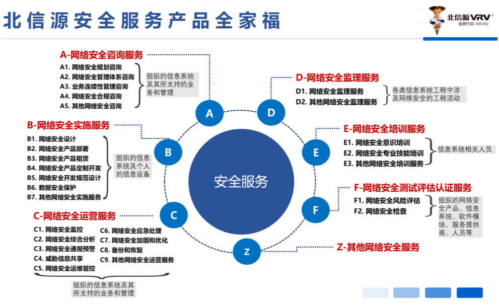 在网络安全产业发展过程中,北信源始终高度重视安全服务业务,拥有业界最完善的安全服务资质体系,安全服务产品系列覆盖面广、服务数量多,涵盖了网络安全咨询服务、网络安全实施服务、网络安全运营服务、网络安全监理服务、网络安全培训服务及网络安全测试评估认证服务等共六大类20+种子类服务产品,从计划、评估、规划、实施,再到持续安全运营等安全建设不同阶段,为客户提供模块化、体系化的安全服务支撑。