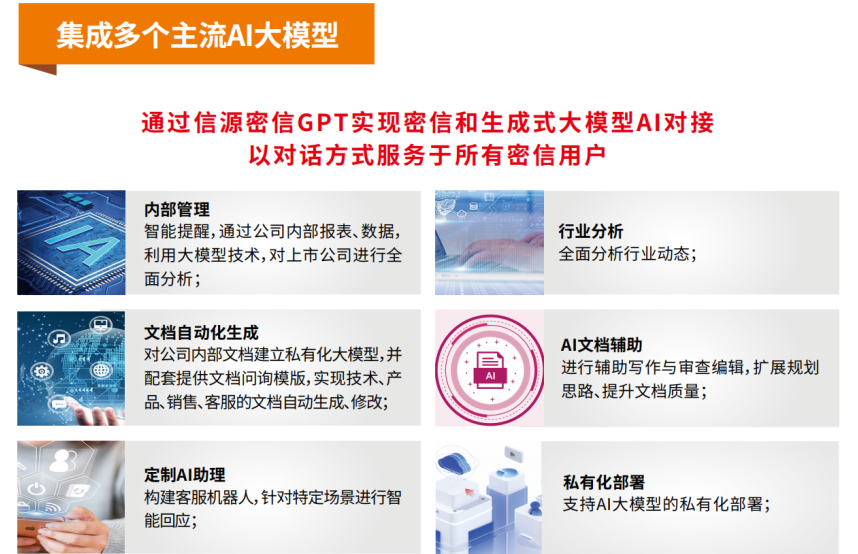 对于上述核心优势之一的信源密信,北信源董事长林皓表示:“北信源不仅做安全服务,还打造安全应用生态。而应用系统和一些开发环境都要用到信源密信安全通信底座,所以我们的布局是向整个安全生态方向延伸。”与一般即时通信产品不同,信源密信主打“安全连接,智慧联合”。林皓表示,“信源密信要做AI(人工智能)+IOT(物联网)的社交平台。”而信源密信也是北信源在人工智能领域的第一步尝试,已完成百度文心一言、阿里通义千问、科大讯飞星火、华为盘古、清华大学ChatGLM等国内头部AI大模型的技术性对接,融入了北信源的全方位安全能力,为用户提供多种AI产品选择。