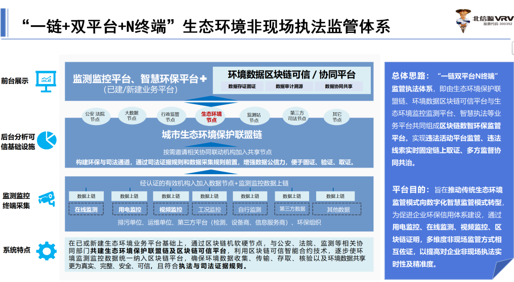 本次获评《2023北京数字化创新解决方案》的北信源“区块链生态环境监管平台”是全国首个以“智慧执法为中心、监管预防为抓手”的区块链生态环境监管平台。该平台由滨州生态环境局邹平分局牵头建设,通过区块链、物联网等技术融合,实现监测监控设备链上备案、运维过程链上留痕、数据加密共享等功能,把环境数据变为司法证据,多部门链上共同使用、管理和监督,形成一链+双平台+N终端的生态环境治理应用体系,有效解决电子数据取证固证、涉刑电子数据审查认定、数据安全传输、按需共享等难题,震慑减少违法违规行为,实现非现场执法监管更精准高效。助力生态环境保护监管智慧化、数字化、精准化,提高监控预警能力和科学办案水平。