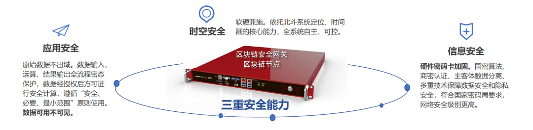区块链机直接以硬件作为节点,具备应用、时空、信息三重安全能力,可满足跨链兼容包含金链盟FISCOBCOS、CONFLUX等在内的多种国内自主区块链底层技术,获得《商用密码产品认证证书》,目前已应用于数据确权、数据存证和防伪溯源等场景,并在城市治理、医疗健康、司法等领域得到创新应用。