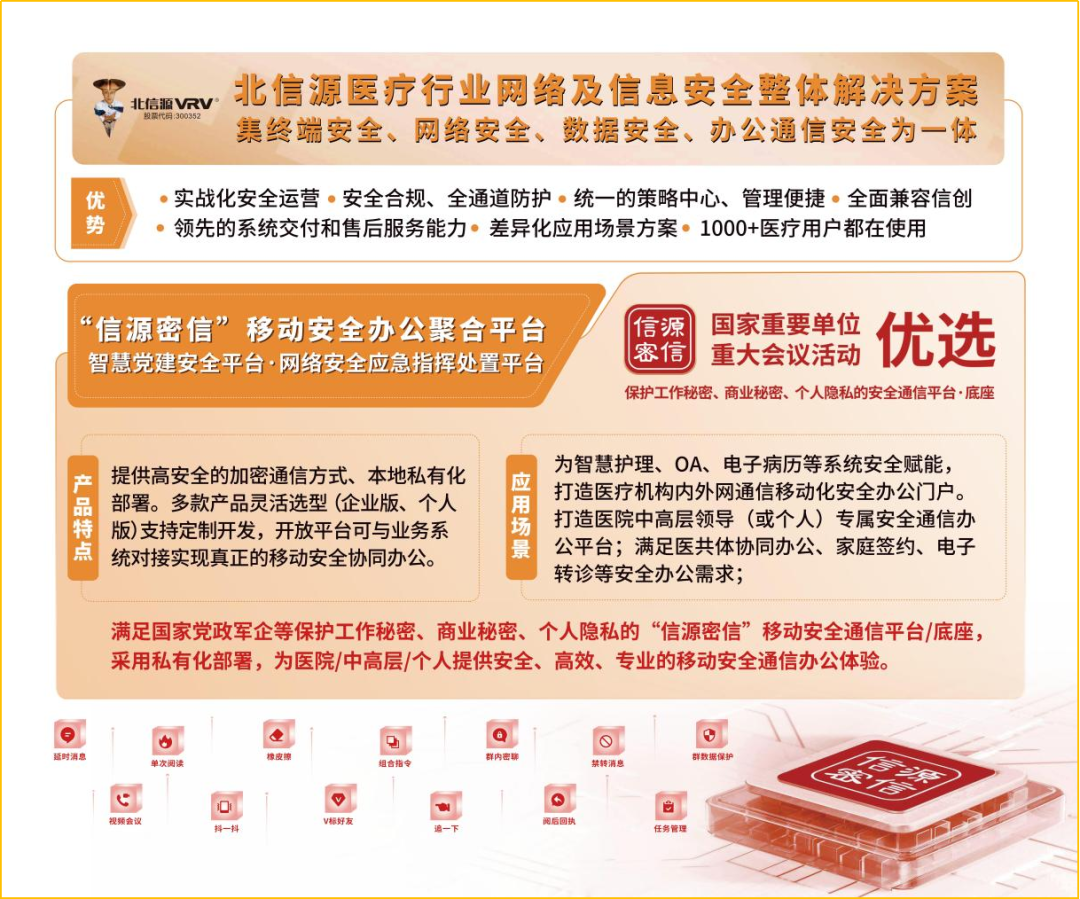 医疗领域客户一般在网络安全方面关注信息传输的安全性,数据的安全性、可信和可溯源,以及终端的运营防护。北信源在本次展会上主要展示了在医疗行业网络安全领域的创新成果和实践经验。如投资10亿元开发的私有化部署安全即时通信系统“信源密信”,可直接对接医疗单位的业务系统,开展安全即时通信、加密视频会议、协同办公和应用管理等,具备数字化、移动化、安全化的特点。