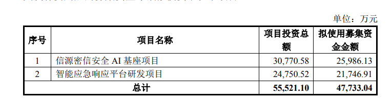 公告显示,本次募集资金拟投向“信源密信安全AI基座项目”和“智能应急响应平台研发项目”,两大项目的投资总额约为5.55亿元。