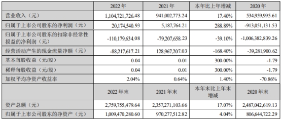 东土科技2022年营业收入为11.05亿元,同比增长17.40%;归属于上市公司股东的净利润为2017.45万元,同比增长288.89%;归属于上市公司股东的扣除非经常性损益的净利润为-1.10亿元,上年同期为-7920.77万元;经营活动产生的现金流量净额为-8821.76万元,上年同期为1.29亿元。
