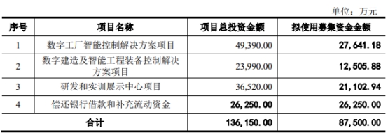 东土科技2023年5月15日发布的向特定对象发行A股股票募集说明书(三次修订稿)显示,公司本次向特定对象发行股票募集资金总额(含发行费用)不超过人民币87,500.00万元(含87,500.00万元),扣除发行费用后募集资金净额拟投资于数字工厂智能控制解决方案项目、数字建造及智能工程装备控制解决方案项目、研发和实训展示中心项目、偿还银行借款和补充流动资金。
