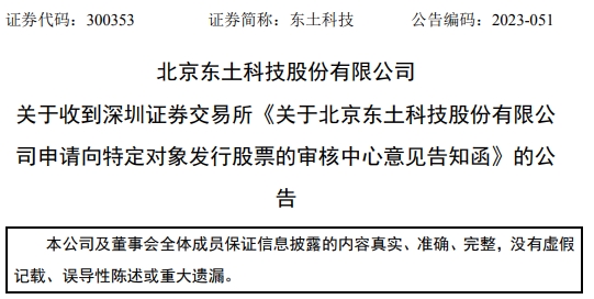 中国经济网北京5月18日讯东土科技(300353.SZ)于今日早间发布公告,公司于2023年5月17日收到深交所上市审核中心出具的《关于北京东土科技股份有限公司申请向特定对象发行股票的审核中心意见告知函》。深交所发行上市审核机构对公司向特定对象发行股票的申请文件进行了审核,认为公司符合发行条件、上市条件和信息披露要求,后续深交所将按规定报中国证监会履行相关注册程序。