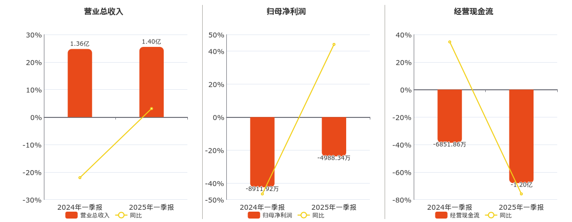 公司营业总收入为1.40亿元。归母净利润为-4988.34万元。经营活动现金净流入为-1.20亿元,较去年同报告期经营活动现金净流入减少5197.53万元。