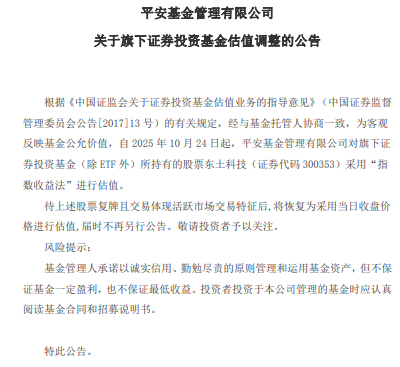公告称,自2025年10月24日起,平安基金管理有限公司对旗下证券投资基金(除ETF外)所持有的股票东土科技(证券代码 300353)采用“指数收益法”进行估值。