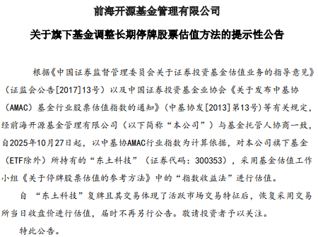 公告称,自2025年10月27日起,以中基协AMAC行业指数为计算依据,对本公司旗下基金(ETF除外)所持有的“东土科技”(证券代码:300353),采用基金估值工作小组《关于停牌股票估值的参考方法》中的“指数收益法”进行估值。