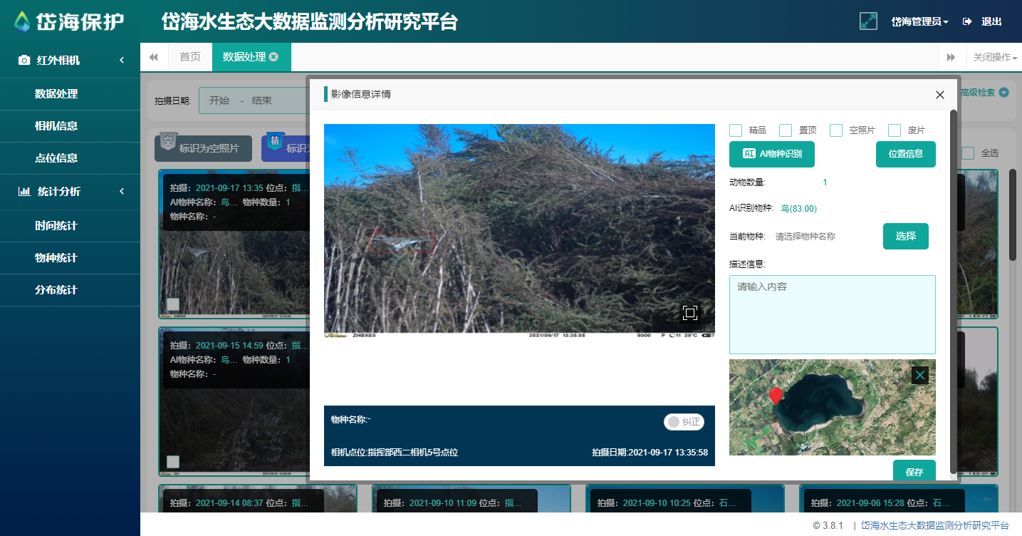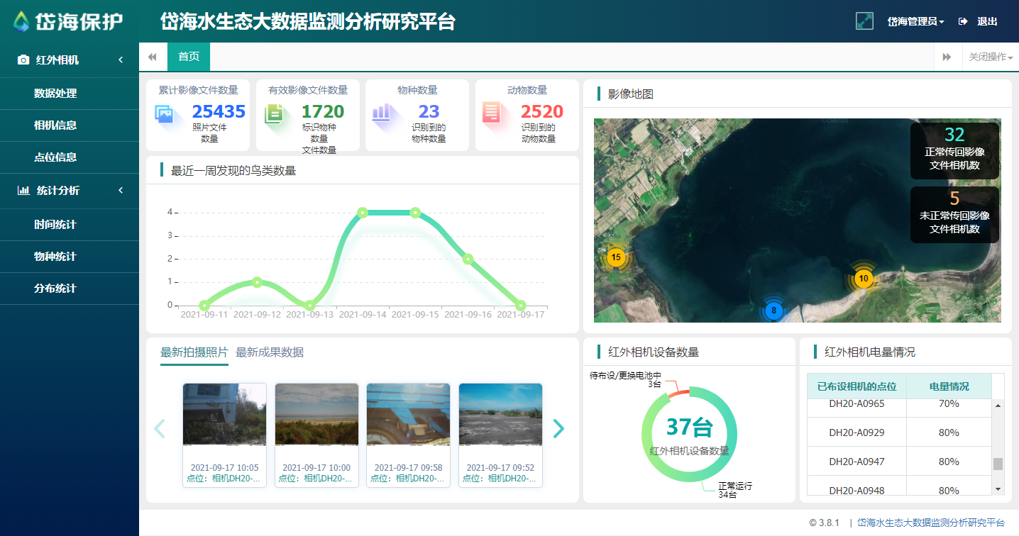岱海湖是内蒙古第三大内陆湖,湿地生物物种多样性丰富,是候鸟南北迁徙通道的重要栖息地,也是鸟类群落动态及保护研究重要的观测地。截止到2021年9月,蒙草·小草数字承建的岱海水生态大数据监测平台已布设37台野生动物监测红外触发相机,投入运行6个月以来共拍摄超2.5万张野生动物活动照片,并运用AI模型算法对识别出的23种动物进行智能识别和数量统计。