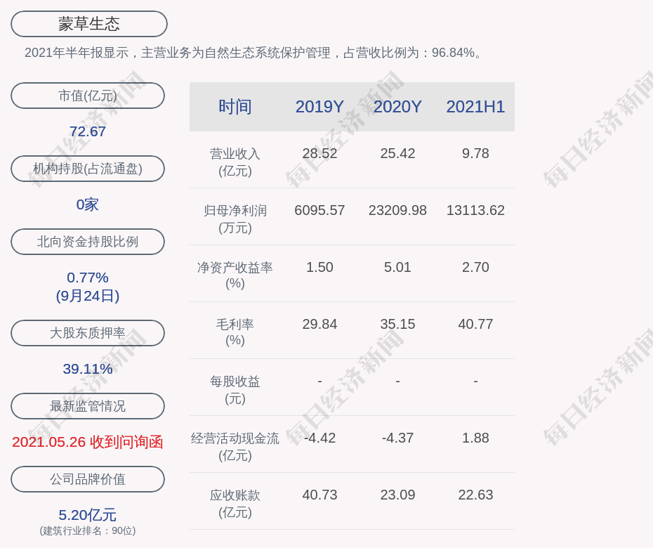 2021年半年报显示,蒙草生态的主营业务为自然生态系统保护管理,占营收比例为:96.84%。