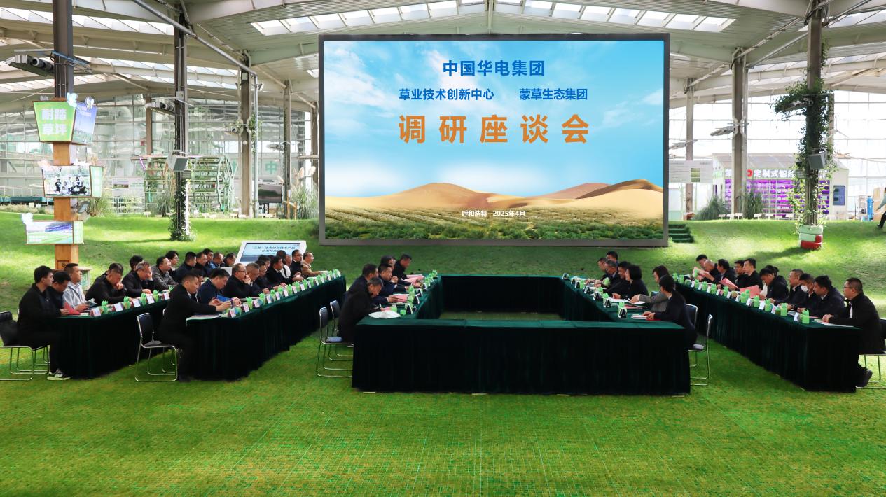 中国华电集团内蒙古公司、新疆公司、青海公司、甘肃公司相关负责人,中电建北京院团队,中国治沙暨沙业学会和内蒙古自治区防沙治沙基金会代表,蒙草生态创始人、科研总负责人王召明,蒙草生态党委书记、董事长兼总裁、草创中心理事长朱长虹参加调研座谈。