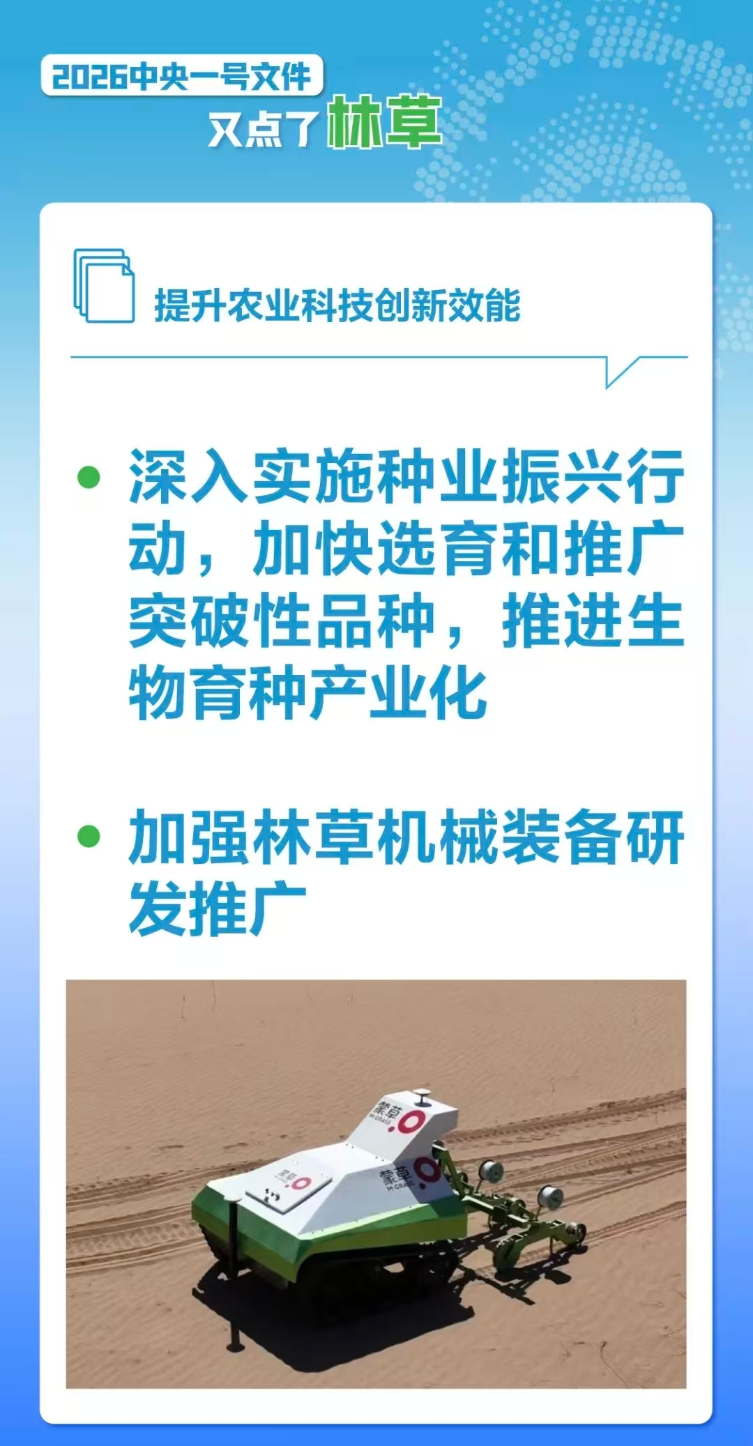 2026年中央一号文件近日正式发布,围绕种业振兴、林草机械推广、“三北”工程建设等核心领域作出部署,明确了生态修复与草产业的发展方向,为相关领域市场主体发展明晰政策导向、释放发展机遇。蒙草生态作为中国唯一一家聚焦草种科技的生态科技型上市公司,凭借与政策导向高度契合的核心业务布局,以及在草种选育、林草机械研发、可持续防沙治沙等领域积淀的技术、产品与服务优势,成为精准承接此次政策红利的重要市场主体之一。