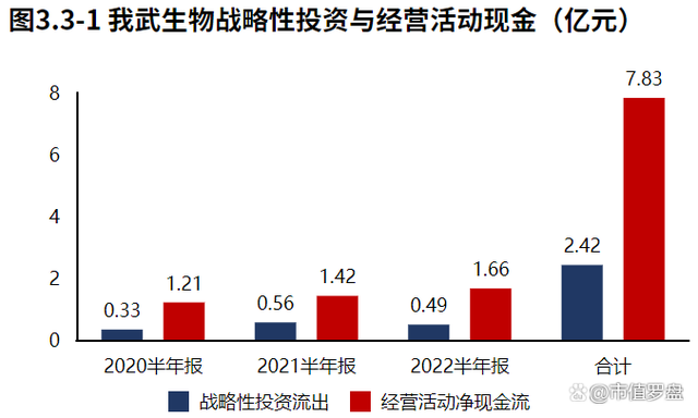 经营活动的造血能力能够覆盖战略投资的资金流出。我武生物2022半年报战略投资资金流出0.49亿元,较2021半年报减少664.47万元,增速-11.90%,战略性投资的资金投入有所降低。我武生物2020年报到本期战略投资资金流出2.42亿元,经营活动产生现金净流入7.83亿元,经营活动的造血能力能够覆盖战略投资的资金流出。