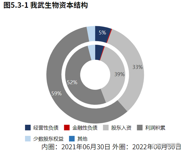 资金来源上表现出造血支撑度进一步加强的趋势。从2022年06月30日我武生物的负债及所有者权益结构来看,公司的资本引入战略为均衡利用利润积累、股东入资的并重驱动型。其中,利润积累是资产增长的主要推动力。与2021年06月30日相比,留存资本占比明显增长,股东入资占比明显降低,公司在资金来源上表现出留存资本支撑度增加的趋势。