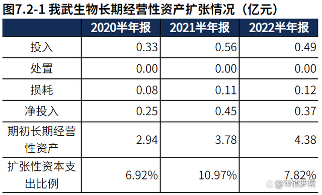 产能基本稳定。 2022半年报我武生物产能投入0.49亿元,处置10.00万元,折旧摊销损耗0.12亿元,新增净投入0.37亿元,与期初经营性资产规模相比,扩张性资本支出比例7.82%。