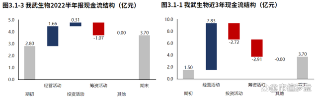 从我武生物2022半年报的现金流结构来看,期初现金2.80亿元,经营活动净流入1.66亿元,投资活动净流入0.31亿元,筹资活动净流出1.07亿元,累计净流入0.90亿元,期末现金3.70亿元。