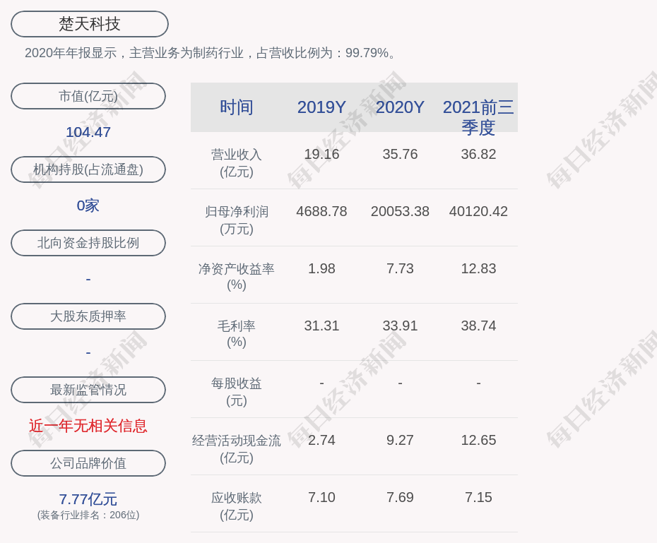 2020年年报显示,楚天科技的主营业务为制药行业,占营收比例为:99.79%。