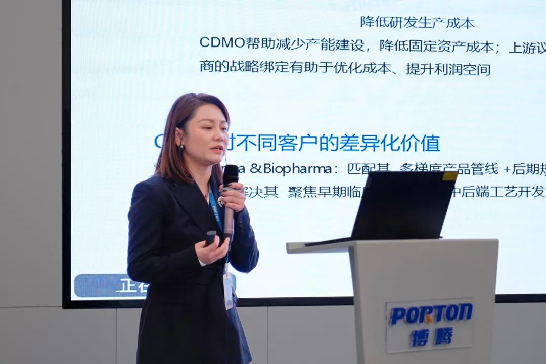 主题报告环节,博腾副总经理孟凡女士聚焦 CDMO 在医药创新生态中的枢纽作用发表主旨演讲,她强调科技创新是博腾立足行业的核心竞争力,面对全球医药产业“专业化、精细化、定制化”分工趋势,博腾深耕连续化反应、生物催化、AI 辅助工艺设计等前沿技术领域,搭建起覆盖化学小分子、多肽/寡核苷酸、蛋白与偶联药物、细胞与基因治疗的全技术平台,可提供从临床前到商业化的全生命周期解决方案。
