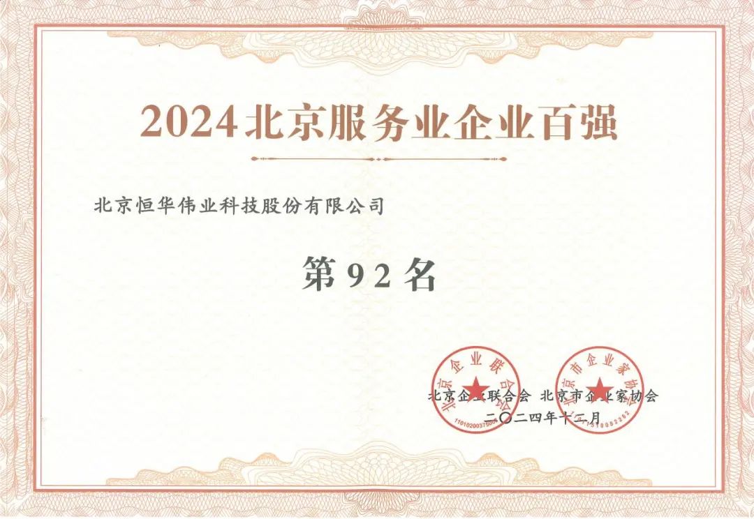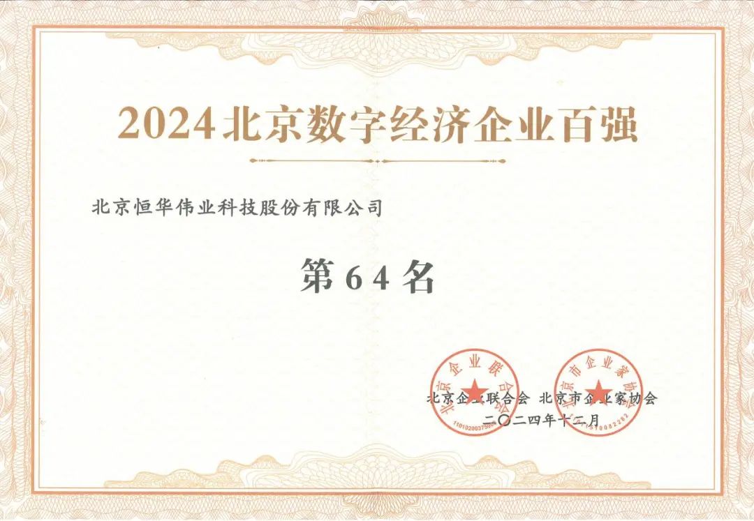 12月24日,由北京企业联合会、北京市企业家协会和中关村数字经济产业联盟主办的“2024京津冀产业链供应链协同发展大会暨北京百强企业论坛”在京举行。会上发布了2024北京企业百强系列榜单。恒华科技凭借优异的综合实力和在数字化领域卓越的表现,成功入围“2024北京数字经济企业百强”、“2024北京服务业企业百强”榜单。