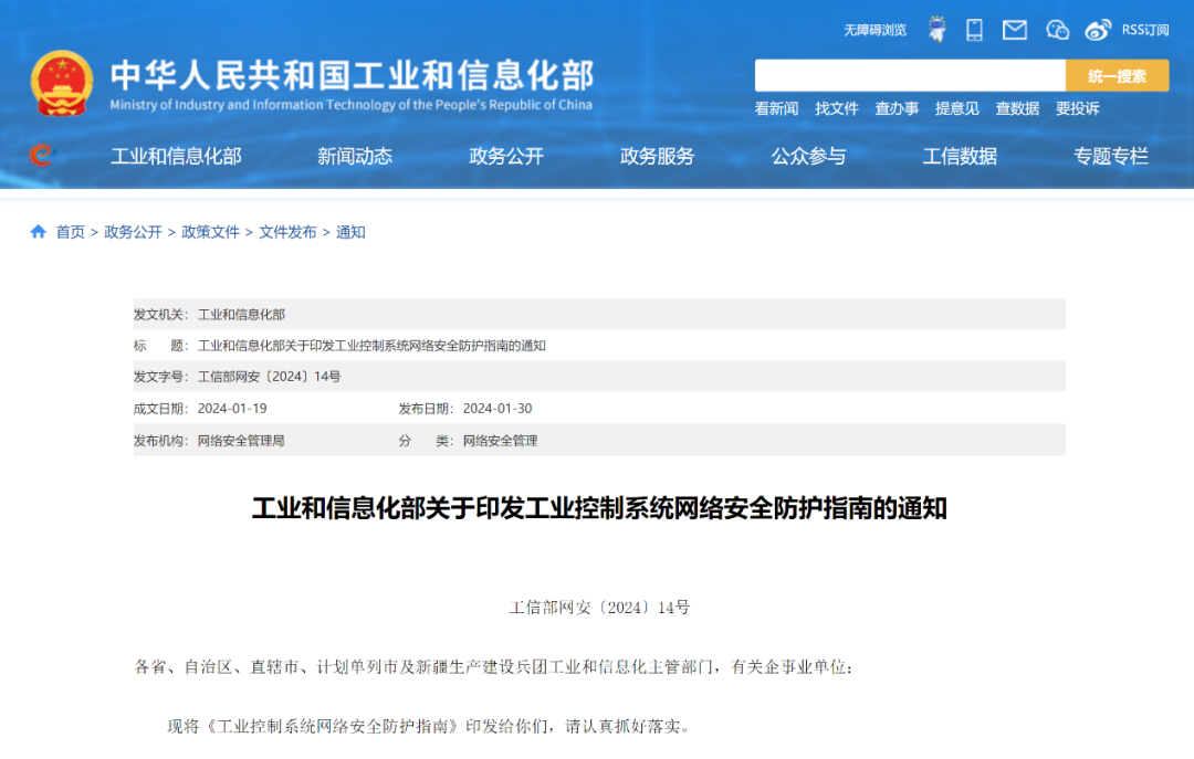 工业控制系统是工业生产运行的基础核心。随着制造业数字化转型步伐加快,工控系统数字化、网联化、智能化趋势明显,工业企业面临的网络安全风险与日俱增,工业企业加强网络安全防护需求迫切。为适应新时期工业控制系统网络安全形势,进一步指导企业提升工控安全防护水平,夯实新型工业化发展安全根基,工信部于2024年1月30日发布“工信部网安〔2024〕14号《工业控制系统网络安全防护指南》(以下简称《指南》)”。