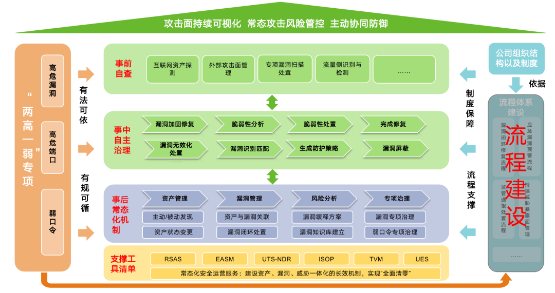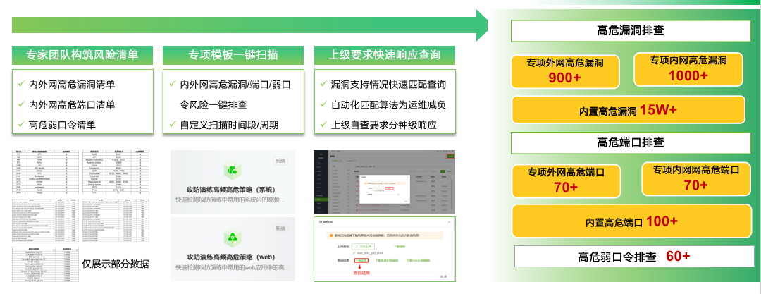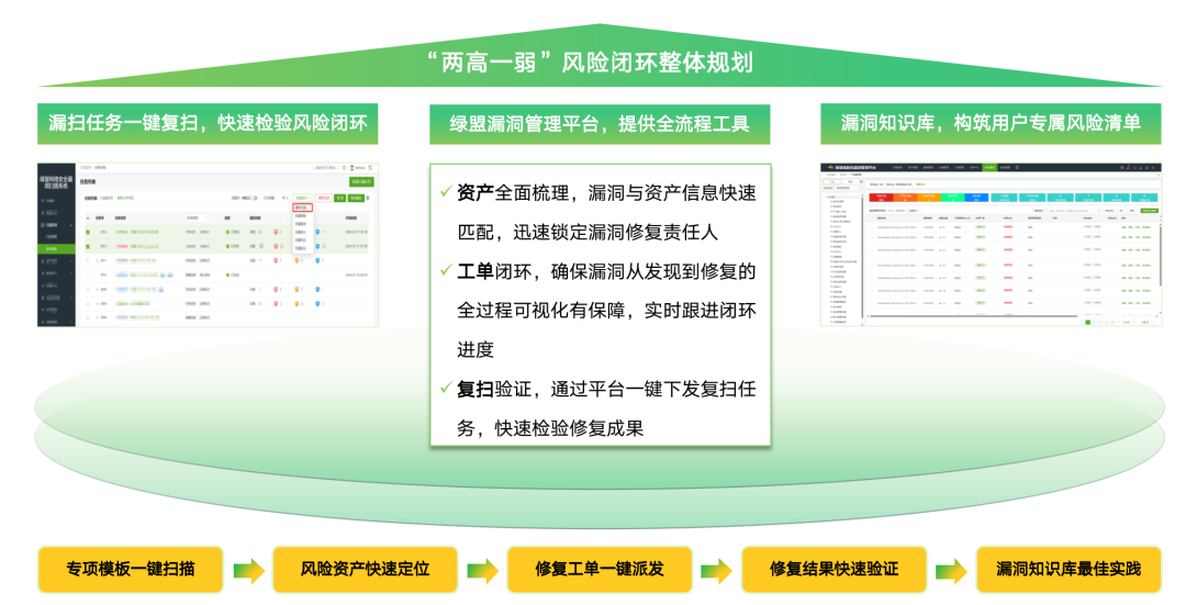 绿盟科技推出“两高一弱”专项解决方案,依托多维度风险主动探测、流量分析被动风险识别、高危漏洞无效化防护、多源风险统一闭环管理等关键技术能力,构建事前自查自检、事中自主治理、事后常态化风险运营的管理和技术体系,建立资产、风险、威胁一体化管理的长效机制。