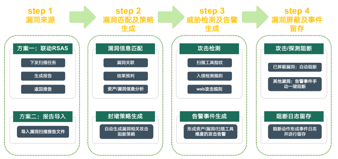漏洞无效化技术,助力消除高危漏洞风险短期无法修复风险:基于扫描工具的指纹特征进行识别,自动进行会话阻断,并同时生成自动阻断规则,最终实现基于扫描IP的持续生效的阻断指令;基于漏洞维度的精准防护能力,自动匹配资产漏洞及攻击信息,形成针对高危漏洞的自动化防护。