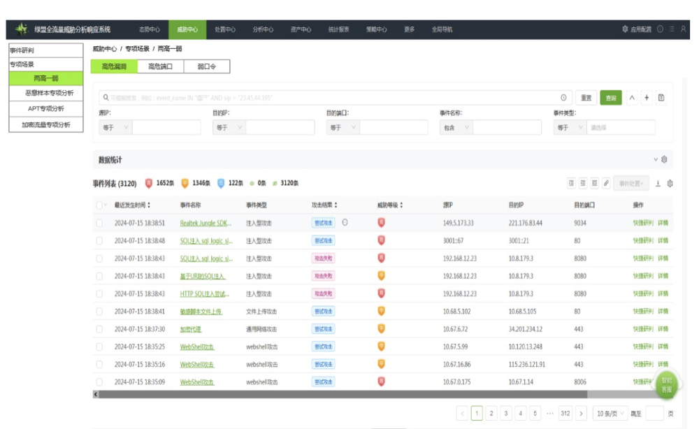 被动流量分析系统,高精度交叉验证两高一弱风险问题:绿盟全流量威胁分析响应系统基于被动流量数据分析,基于网络访问行为信息识别高危端口服务、高危漏洞、存活弱口令信息,有效提高两高一弱风险发现精确度。