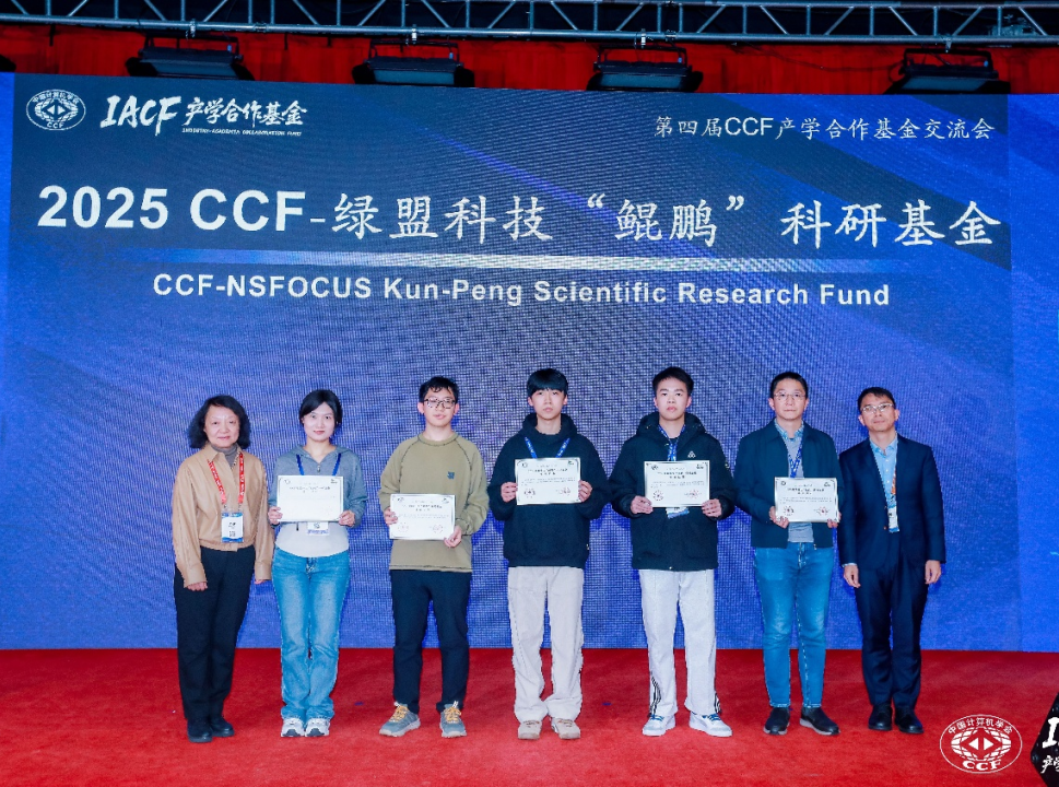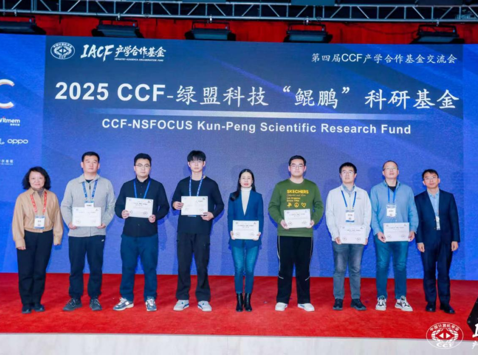 本届盛会期间,第四届CCF产学合作基金交流会顺利举行,会上颁发了CCF-绿盟科技“鲲鹏”科研基金证书。在颁证环节,CCF会士、监事长、北京大学金芝教授与绿盟科技能力中心总经理范敦球共同为2025年CCF-绿盟科技“鲲鹏”科研基金获得者颁发证书。