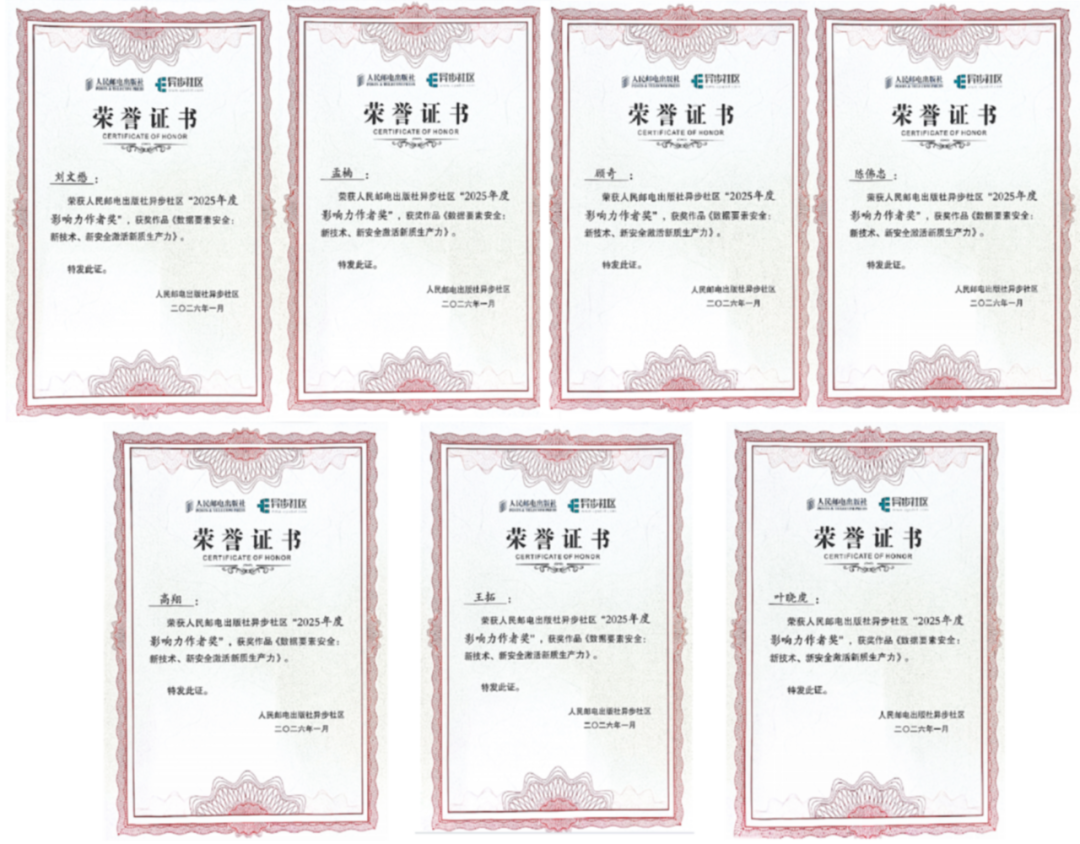 2026年1月,由绿盟科技牵头编写《数据要素安全:新技术、新安全激活新质生产力》的作者团队,凭借扎实的技术沉淀与行业洞察力,荣获人民邮电出版社异步社区“2025年度影响力作者奖”。该奖项聚焦年度内在技术深度、行业影响力与专业价值维度表现突出的作者及作品。此次获奖,不仅是行业对该书技术内容专业性、实践指导性与长期传播价值的高度认可,更是对绿盟科技在数据要素安全领域深耕细作的有力佐证。