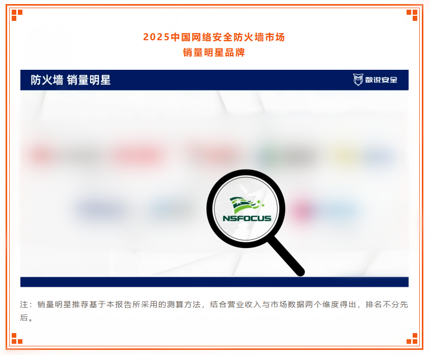 近日,数说安全发布“2025中国网络安全防火墙市场销量明星品牌”榜单。绿盟科技防火墙获得市场广泛认可,被列为“销量明星产品”。