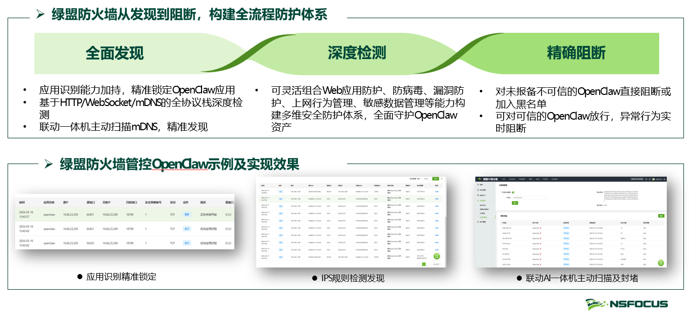 针对OpenClaw(俗称“龙虾”)应用从发现到阻断,构建全流程防护体系,基于应用识别能力加持,精准锁定OpenClaw应用,对未报备不可信的OpenClaw直接阻断或加入黑名单;可对可信的OpenClaw放行,异常行为实时阻断。让每一次AI交互,都可见、可控、可信任——为AI时代筑起安全的护栏。