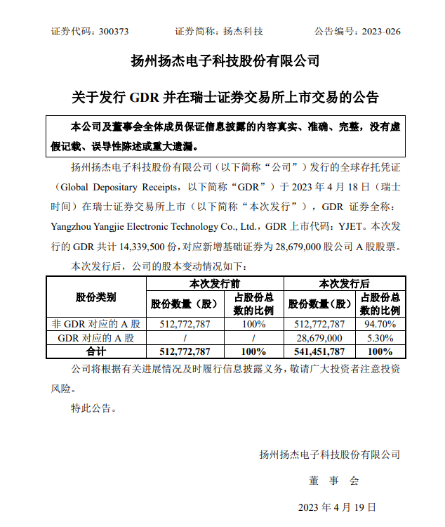 扬杰科技4月19日早间公告,扬州扬杰电子科技股份有限公司发行的全球存托凭证(简称“GDR”)于2023年4月18日(瑞士时间)在瑞士证券交易所上市。本次发行的GDR共计14,339,500份,对应新增基础证券为28,679,000股公司A股股票。