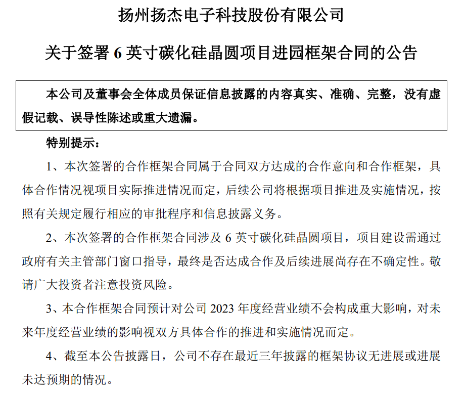 4月20日晚间,扬杰科技发布公告,已于4月18日与扬州市邗江区政府签署《6英寸碳化硅晶圆项目进园框架合同》,拟在当地投资新建6英寸碳化硅晶圆生产线项目,总投资约10亿元。