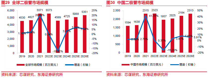 (3)二极管行业已趋饱和,预计2023年全球市场规模将小幅降至45.69亿美元,2026年逐步增长至53.51亿美元。由于二极管行业技术壁垒较低,行业参与者众多,近年来市场规模表现较为稳定,2022年达到短期峰值,2023年下滑后2024年重新步入上行通道。据芯谋研究数据,2022年全球二极管市场规模达55.73亿美元,与上年同期基本持平,2019-2022年年均复合增长率达7%,预计2023年市场规模达45.69亿美元,2026年逐步增长至53.51亿美元,国内市场表现与全球市场趋同。