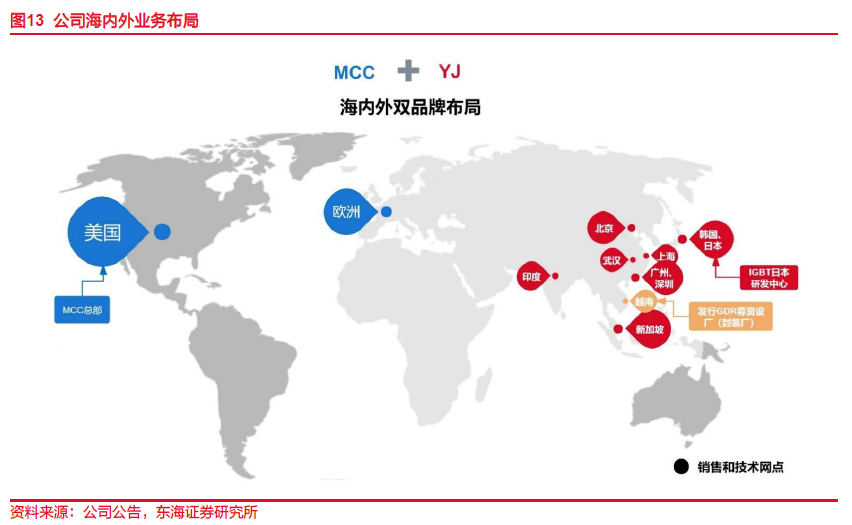 (1)公司实行“双品牌”+“双循环”及品牌产品差异化的业务模式。2015年,公司收购美国MCC半导体公司,在欧美市场,公司主推“MCC”品牌产品,对标安森美等国际第一梯队公司。在中国和亚太市场,公司主推“YJ”品牌产品,通过持续扩大直销渠道网点,与各行业TOP大客户达成战略合作伙伴关系。目前,公司设有深圳、上海、北京、广州、武汉等20多个境内销售和技术服务站,境外设有美国、韩国、日本、印度、新加坡等12个国际营销、技术网点。与此同时,公司积极响应国家“国内国际双循环相互促进发展”的号召,积极拓展国际业务。2023年上半年,公司发行GDR募集资金在越南投资设立下属子公司美微科(越南)有限公司,建立东南亚国家建设封装测试生产线,投资总额8.74亿元,深耕国际市场,进一步优化公司的全球产业布局。