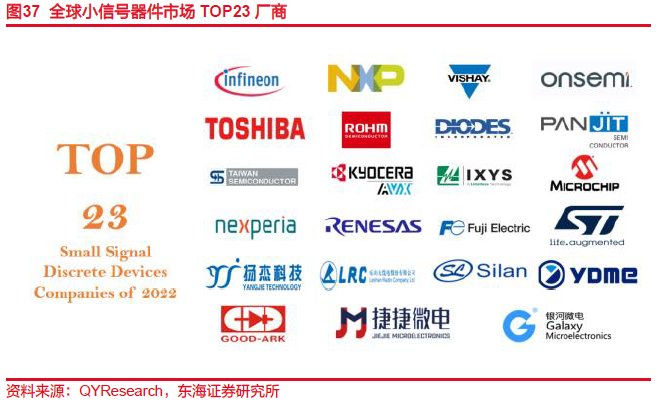 (4)在小信号器件市场中,海外企业占据领先地位,但国内企业也处于高速发展中,在中低端领域基本实现了国产替代。欧美、日本、中国台湾地区等境外厂商具有先发优势,在全球竞争中保持优势地位,在中低端领域,国产小信号产品具有性价比基本形成了进口替代,在中高端领域客户以性能为主要考虑因素,仍以进口产品为主,例如在小信号MOSFET细分领域,海外厂商技术成熟,小信号MOSFET产品系列丰富以满足不同负载要求,下游客户为保证适配性更倾向于选择海外品牌产品,绝大多数市场份额被国际大厂占据,头部TOP5企业分别是Infineon、NXP Semiconductor、Vishay、ONSemiconductor和Toshiba,市场份额超过了52%。但近年来国产厂商加速赶超技术,国产替代率也在持续上升中,根据QYResearch报告显示,国内共有8家企业进入2022年全球小信号市场TOP23厂商行列,依次分别为闻泰科技收购的安世半导体、扬杰科技、乐山无线电、士兰微、燕东微、苏州固锝、捷捷微电、银河微电,其中安世半导体位列13,扬杰科技位列17。