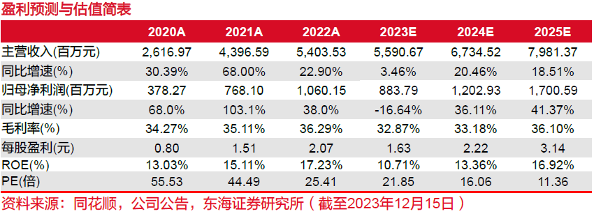 盈利预测结果:公司2023-2025年营业收入分别为55.91、67.35、79.81亿元,同比增速分别为3.46%、20.46%、18.51%;归母净利润分别为8.84、12.03、17.01亿元,同比增速分别为-16.64%、36.11%、41.37%。预期未来高毛利率海外业务去库存结束后有望复苏与增长,公司2023-2025年毛利率分别为32.87%、33.18%、36.10%。