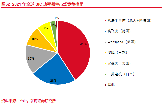 (6)全球SiC功率器件绝大多数市场份额由海外巨头攫取,2021年全球市场CR3为79%。根据yole数据,2021年全球碳化硅器件市场中海外龙头占据90%以上的市场份额,前三大企业分别为意法半导体、英飞凌、wolfspeed,市场份额分别为41%、23%和15%,CR3为79%。国内厂商占据的市场份额不足1%,国内企业在材料、产能、尺寸、器件各方面的技术水平与国外相比都存在一定差距,致使国内企业的竞争力水平均低于国外企业,随着国内产能逐步释放,技术水平持续提升,成本降低驱使国产替代需求提升,国内企业的竞争能力有望进一步提升。