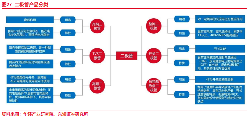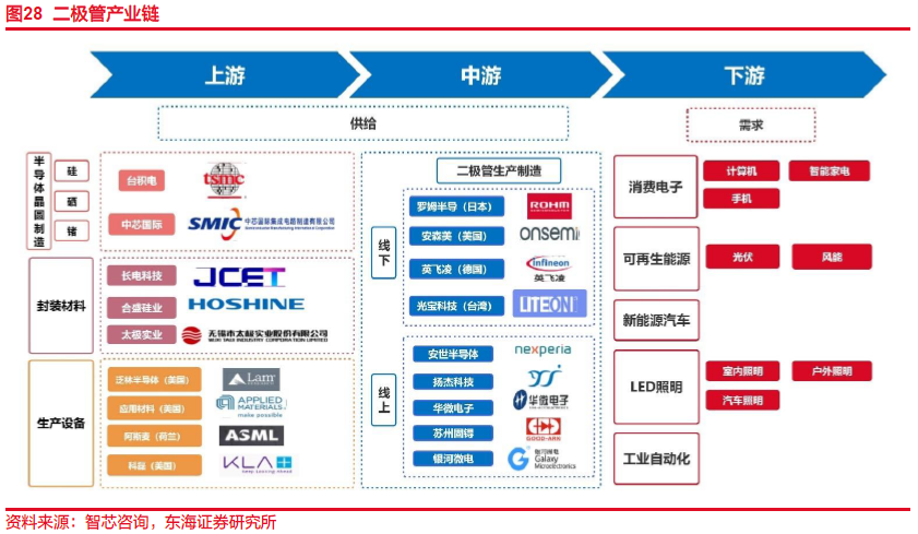 (2)从二极管产业链来看,我国企业均积极布局,目前已经实现初步国产替代,国内核心的二极管生产制造企业包括安世半导体(闻泰科技)、扬杰科技、苏州固锝等。二极管产业链上游主要是硅、硒、锗等晶圆材料、封装材料等原材料供应商以及生产设备供应商,中游主要是指二极管生产制造企业,下游应用领域广泛,包括新能源汽车、计算机、手机、家电等消费电子领域,光伏、风能等可再生能源,包括室内、户外、汽车照明的LED照明以及工业自动化领域。