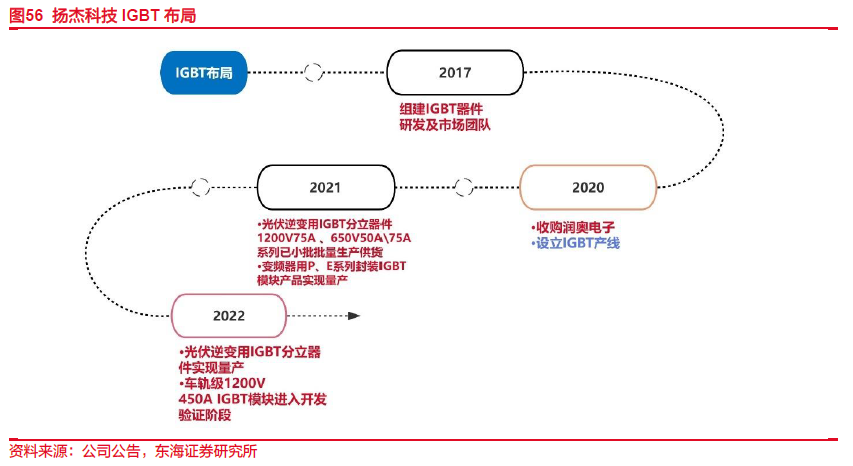 IGBT布局方面,2021年收购江苏润奥设立IGBT产线,2022年投资成都森米合伙企业,间接持股成都森未3%的股份,此后成都森未被高新发展收购,业务端与振华集团合作布局军工领域,扬杰科技目前仍间接持股成都森未,布局了军工IGBT。
