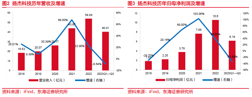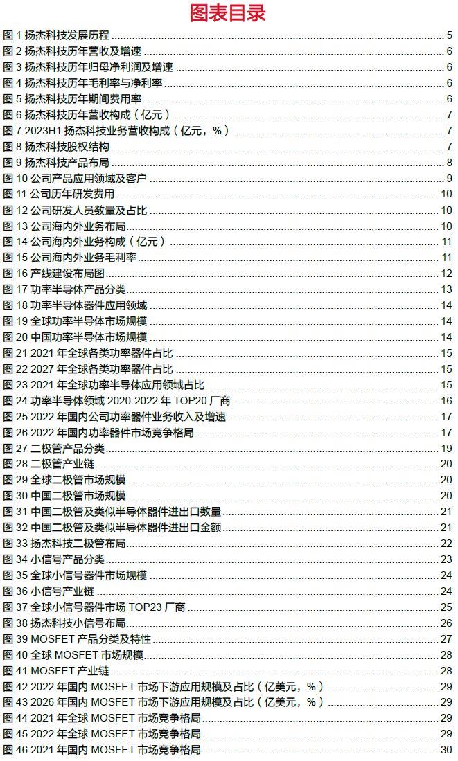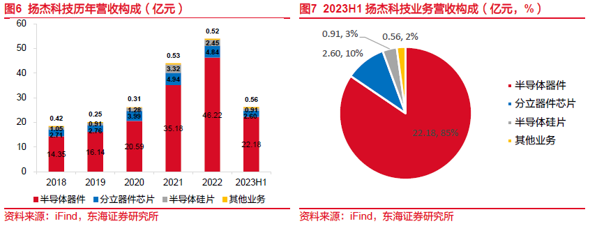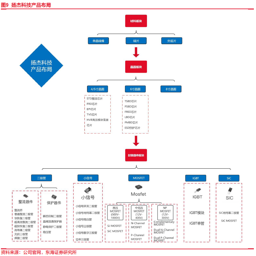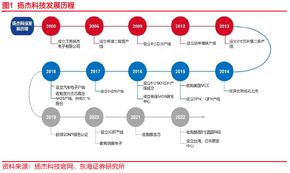 (1)通过收购进军功率半导体领域,实现全产业链布局。扬州杨杰电子科技股份有限公司是国内少数集半导体分立器件芯片设计制造、器件封装测试、终端销售与服务等产业链垂直一体化(IDM)的规模企业,同时在MOSFET、IGBT、第三代半导体等高端领域采用IDM+Fabless相结合的模式。产品线涵盖分立器件芯片、MOSFET、IGBT 功率模块、SiC、整流器件、保护器件、小信号等,为客户提供一揽子产品解决方案。扬杰科技2000年在江苏扬州成立,2009年设立4寸芯片产线,2014年在深交所上市后,通过不断投资并购进行业务扩张和产业链整合,2018年收购宜兴杰芯,主要补充高压MOS技术和产品,同年设立汽车电子产线,2020年收购润奥公司,主要补充晶闸管和少量IGBT产品,同年设立IGBT产线,2021年收购雅吉芯,主要补充外延片技术和产品。