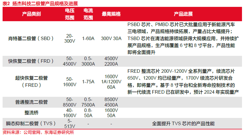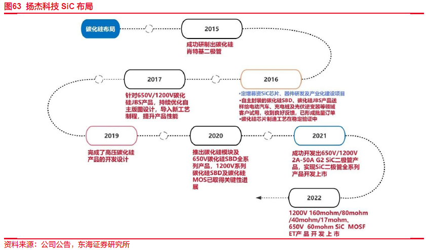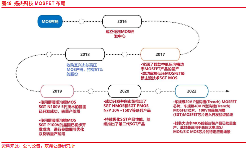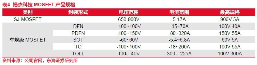 (1)扬杰科技加速研发MOSFET高端产品。公司2016年成立低压MOS研发中心,2017年实现中低压沟槽MOSFET产品的量产,掌握低压MOSFET最先进技术SGT MOS,2018年收购宜兴杰芯高压MOS产线。公司聚焦于高端领域进行开发以满足市场需求,1)SGT-MOSFET板块,公司2020年推出SGT MOS 30V~150V系列产品,并持续优化SGT产品性能,陆续推出了第二代SGT产品,2022年100V屏蔽栅沟槽(SGT)MOSFET芯片进入开发验证阶段;2)SJ-MOSFET板块,2022年封装大功率MOS的新封装产品已批量生产,此封装适用于高压大电流SJ MOS/SiC MOS芯片的特定应用场景,新封装技术将驱动端的源极单独引出,可以降低内部源极连接电感的干扰,有助于提高MOSFET开关速度,降低导通损耗,抑制栅极振荡,并且开通损耗减小19%-5%;3)车规级MOSFET板块,2022年车规级-20V P型沟槽(Trench)MOSFET芯片、车规级40V N型沟槽(Trench) MOSFET芯片进入开发验证阶段。此外,公司完成了CLIP、TOLL等封装形式的开发,PDFN5060高性能超低阻抗Clip/ Dual Pad产品处于开发验证中,可以配合超低内阻MOSFET芯片研发进行新品开发,减小封装的寄生电阻,进一步优化公司低内阻产品性能。