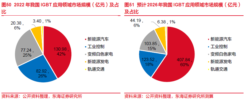 (5)从下游占比来看,2026年预计新能源汽车、工业控制、变频白电、新能源发电、轨道交通分别为60%、18%、15%、6%以及1%。下游应用领域中规模占比最大的前三大领域始终为新能源汽车、工业控制和变频白电,新能源汽车市场将在双碳政策和技术升级双轮驱动下继续保持旺盛需求,其主导地位未来有望得到进一步巩固,市场占比从2022年的42%有望在2026年提升至60%,占据IGBT市场一半以上的份额。