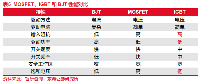 (1)IGBT全称为绝缘栅双极型晶体管,是由双极型三极管(BJT)和绝缘栅型场效应管(MOS)组成的复合全控型电压驱动式功率半导体器件。IGBT兼具MOSFET 及 BJT 两类器件优势,驱动功率小而饱和压降低。金氧半场效晶体管(MOSFET)输入阻抗高、驱动功率小、开关速度快;而双极型三极管(BJT)饱和压降低,BJT更强调工作功率,MOSFET更强调工作频率,因此IGBT兼有以上两种器件的优点,性能优势显著。