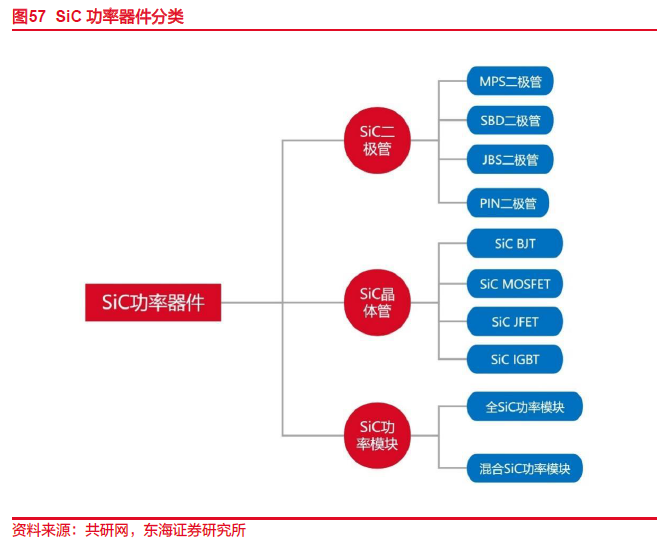 (1)SiC属于第三代宽禁带半导体材料,是由碳元素和硅元素组成的一种化合物半导体材料。SiC器件具有耐高温、高频、耐高压、大功率的特性。SiC功率器件包括SiC二极管、SiC晶体管和SiC功率模块,根据性能不同,SiC二极管可以细分为四种:SBD(肖特基)二极管、PIN(混合PN结)二极管、JBS(结势垒肖特基)和MPS(混合pin/肖特基)二极管,JBS和MPS这两类导通电阻较低浪涌能力较好;SiC晶体管也分为四种:SiC BJT 、SiC MOSFET、SiC JFET、SiC IGBT,与硅基期间相比具有更高的击穿电压和更低的导通电阻;SiC功率模块也分为全SiC功率模块、混合SiC功率模块,混合SiC功率模块用 SiC SBD替换 Si FRD,全SiC 模块采用 SiC SBD与 SiC MOSFET一体化封装。目前SiC SBD二极管和SiC MOSFET 应用最广泛、市场化成熟度最高。