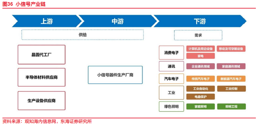 (3)从小信号产业链来看,上游主要为晶圆代工厂、半导体材料与生产设备供应商,下游应用范围广泛。小信号产业链中游为小信号器件生产商,其中国产产品多为小信号二极管。小信号分立器件是电子电路的基础元器件,是各类电子产品线路中不可或缺的重要组件,广泛应用于小电流、高功率的工作场景,其中汽车电子、工业、消费电子是主要的三大应用领域,汽车电子领域主要由新能源汽车行业的快速崛起驱动,工业领域中工业控制细分市场是最重要的应用场景,作为高压高频要求的高端应用领域国产替代率较低,发展空间较大,消费电子中计算机、智能手机等移动设备及可穿戴设备中都广泛使用了小信号器件,例如一些手机中基带部分就使用了数十只小信号分立器件。此外,通讯及绿色照明市场等领域近年来也高速发展,成为下游中重要的增量市场。