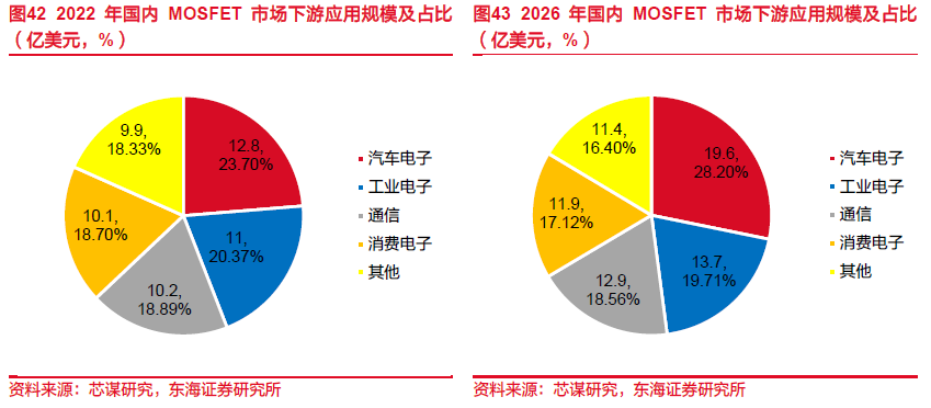 (4)在国内MOSFET市场中,汽车电子是体量最大的下游应用市场,2026年应用领域占比有望从2022年的23.70%增长至28.20%。在国内MOSFET市场中,汽车电子、工业、通信、消费电子是主要的四大应用领域,根据芯谋研究数据,汽车电子领域占比最大,受益于新能源汽车景气持续,主体地位将继续得到巩固,2026年国内汽车电子领域MOSFET市场规模有望从2022年的12.8亿美元增长至19.6亿美元,CAGR达11.24%,下游占比也将从2022年的23.70%提高到28.20%,其他领域占比变动不大,2026年工业、通信、消费电子各下游领域占比将分别达到19.71%、18.56%、17.12%。