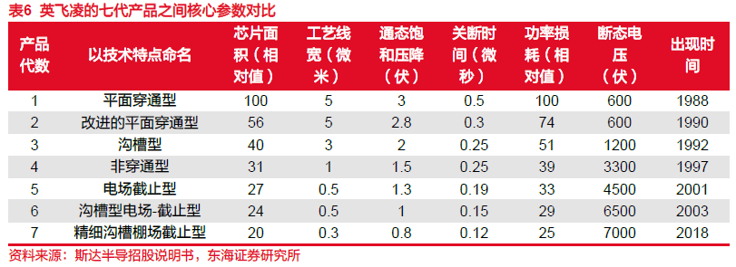 (2)IGBT芯片随着每一代产品的升级,各项性能指标均有提升,考虑成本后,当前性价比较高、应用广泛的是第四代产品。如下所表示,全球IGBT龙头企业英飞凌有史以来诞生了七代不同的产品,每一代产品在结构上有较大的差异,在关键性能指标上也都有较大的提升,相对来说越是先进的产品,性能效果越高,能够将产品研发到第几代技术,某种程度上也说明了企业在绝对技术上的研发实力。如果考虑到成本等因素,IGBT目前性价比较高的产品属于第四代产品。