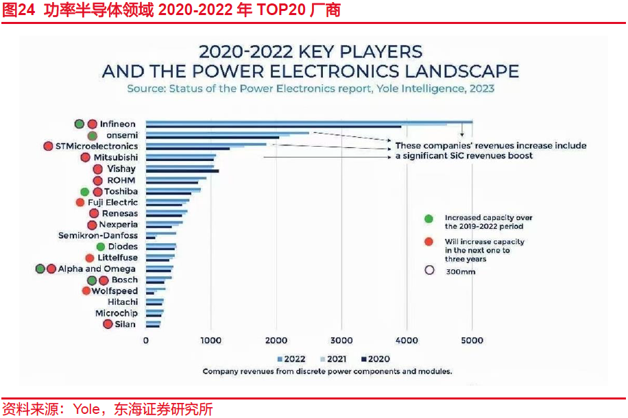 (1)功率半导体市场行业集中度高,海外龙头占据主导地位。全球功率半导体市场份额绝大多数主要由日本、美国、欧洲这些国家和地区的企业占据,根据Yole,2020-2022年前三大厂商均为英飞凌、安森美、意法半导体。其中英飞凌居于绝对龙头地位,功率半导体营收在市场中遥遥领先第二名安森美,是全球业务面最广、体量最大的汽车半导体龙头公司,根据英飞凌年报,2022年实现营收142.18亿欧元,同比增长28.6%,利润为33.78亿欧元,同比劲增63%,利润率为23.8%,同比增长5.1pcts,这三项指标均创历史新高,在汽车功率器件细分领域中占据行业领先地位;安森美是第二大功率半导体供应商,产品布局丰富,2022年实现营收83.26亿美元,同比增长24%,创历史纪录,其中汽车业务增速最快;意法半导体是传统功率半导体龙头公司,是MOSFET领域中的佼佼者,其他主要产品包括SiC和高低压硅二极管、GaN功率器件、射频晶体管、IGBT等,基于SiC的分立器件在下一代电动汽车应用上大获成功。全球前十大厂商中国内只有闻泰科技旗下的安世半导体进入此行列,安世半导体曾为飞利浦半导体标准产品事业部,2019年被闻泰科技收购,其产品线中二极管产品与小型号MOSFET领先优势明显,2022年安世半导体总营收为23.6亿美元,同比增长10.7%,在汽车和工业等重要领域表现良好,2023年上半年,受益于新能源汽车行业的迅速发展带来的持续活跃的需求,来自汽车领域的收入占比为61.05%。据Yole下图统计数据,在前二十大功率半导体厂商中,有14家计划在未来一到三年内增加产能。